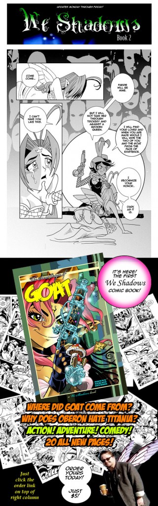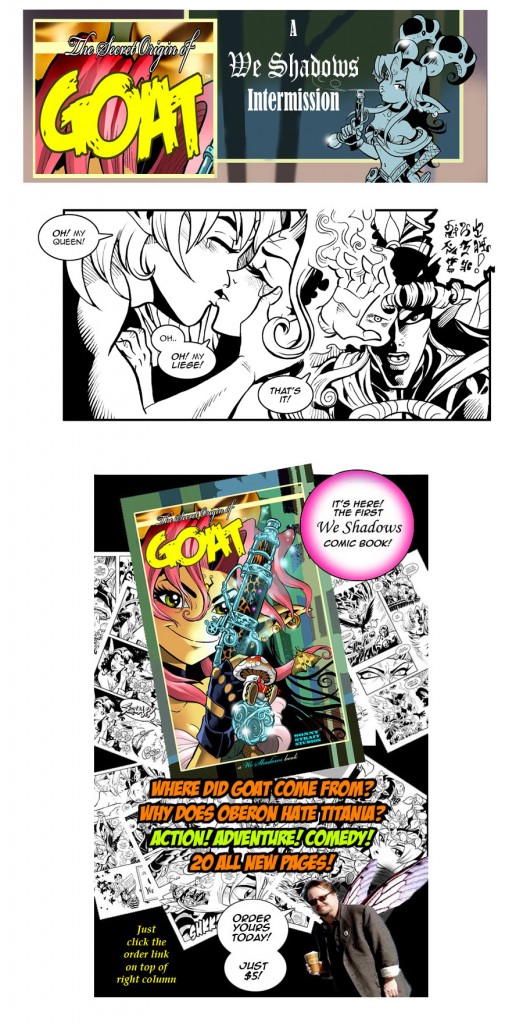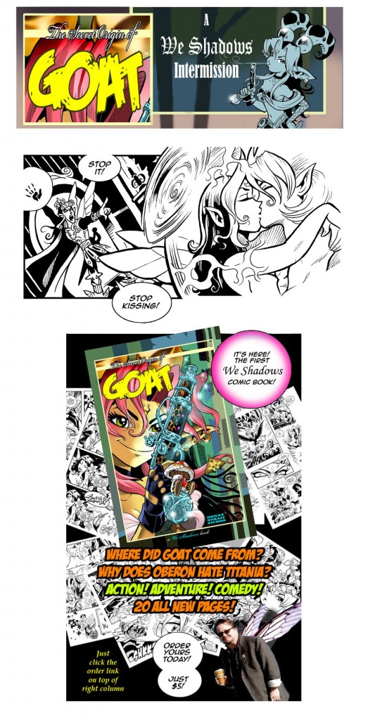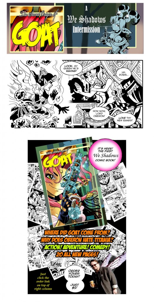 Welcome to what I am calling an intermission between graphic novels. It’s a short story I drew recently that serves as an introduction into We Shadows Book III. It is called The Secret Origin of Goat and goes far back[…]↓ Read the rest of this entry…